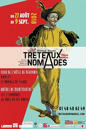 Depuis 19 ans les Tréteaux Nomades ensoleillent la rentrée parisienne en amenant le théâtre au plus proche du spectateur, au cœur de l’ambiance chamarrée et impertinente de la Commedia Dell’arte qui retrouve sa place au sein de la cité. A l'affiche de cette édition haute en couleur : des pirates et des samouraïs nous entraineront dans le sillage de leurs aventures, nous goûterons à la tragédie shakespearienne à la sauce Commedia et suivront les péripéties rocambolesques de Figaro ! Tout un programme ! Fidèle à ses habitudes, le Festival pose ses tréteaux dans des lieux magiques et méconnus de la capitale : la somptueuse Cour de l’Hôtel de Beauvais (4ème) et les charmantes Arènes de Montmartre (18ème).